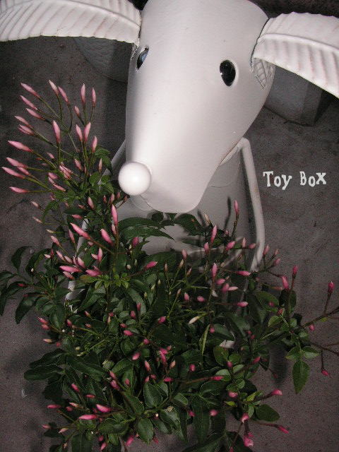 ジャスミンを抱えたワンコ まだ蕾なんだけどね